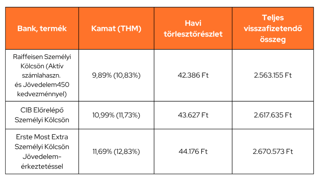 A 2 millió forintos hitelösszeg esetén még csupán egy bank tudott a 10%-os kamatszint alá menni, látható, hogy a legjobb kamatú kölcsönök 10-12% körül vannak ebben az összegsávban. Egy 40-45 ezer forintos havi törlesztőrészlet 5 évig tartó vállalásával egy olcsóbb használt autót vehetsz, vagy pedig a saját önerődet egészítheted ki vele.