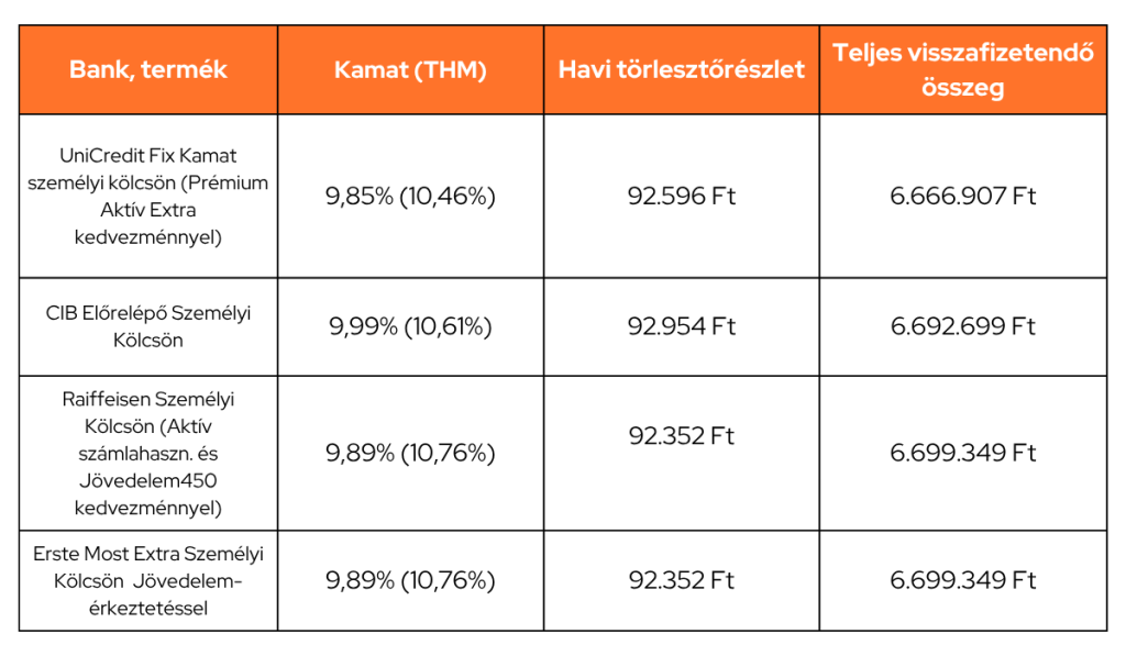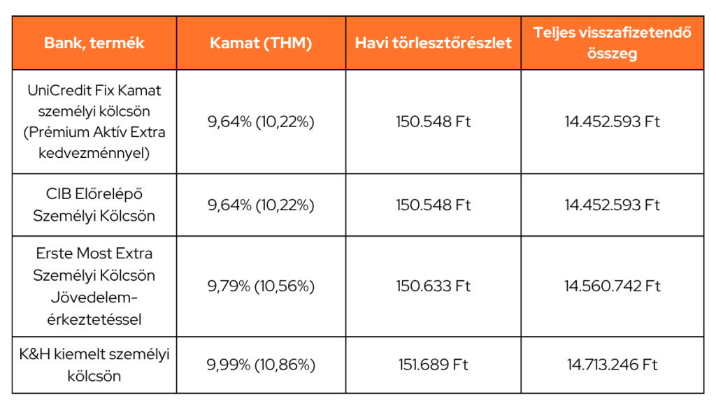 10 milliós autóhitelt havi 150 ezer forintos törlesztőrészlettel lehet felvenni jelenleg a legkedvezőbben, 8 éves futamidőre, ami a legtöbb személyi kölcsön esetén a maximális futamidőt jelenti. Ha még ennél is magasabb összegre van szükséged, néhány bank 15 millió forintig is nyújt személyi kölcsönt.