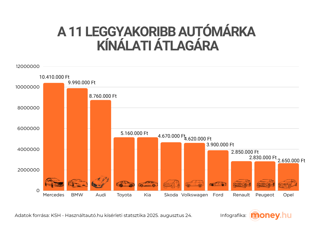 - Őket a hétköznapibb márkák követik: a Kia, a Toyota, a Škoda és a Volkswagen: 4.620.000 Ft – 5.160.000 Ft a kínálati átlagár.