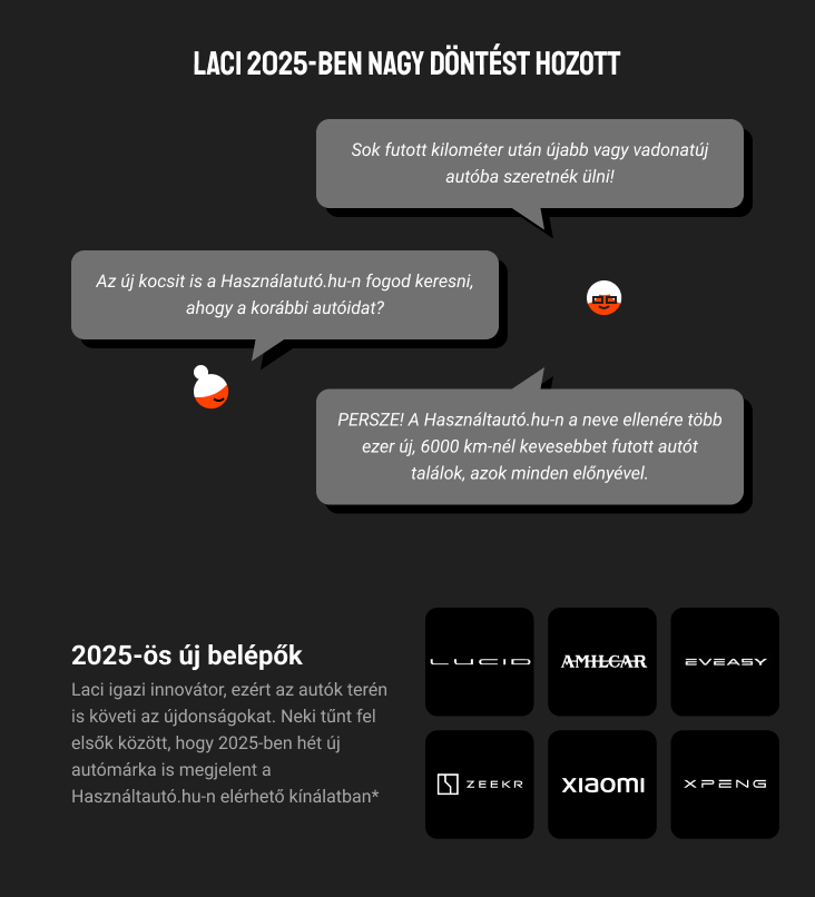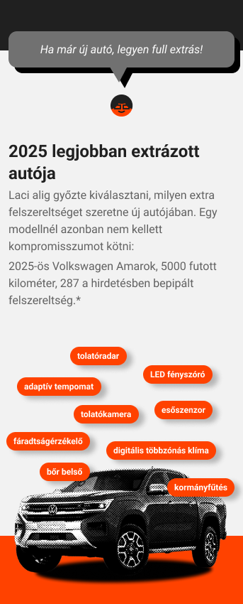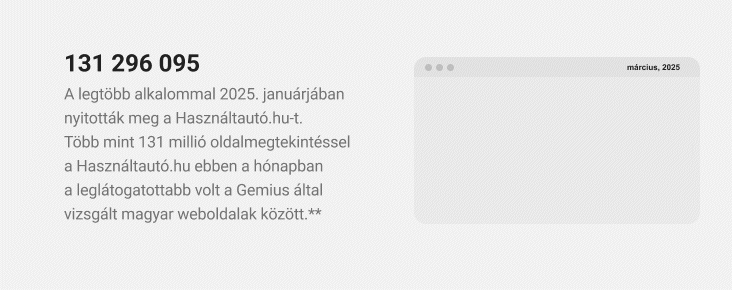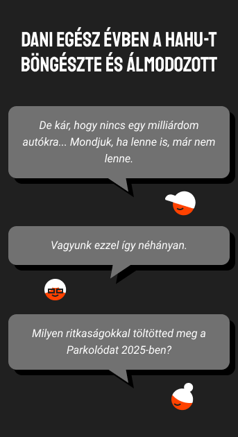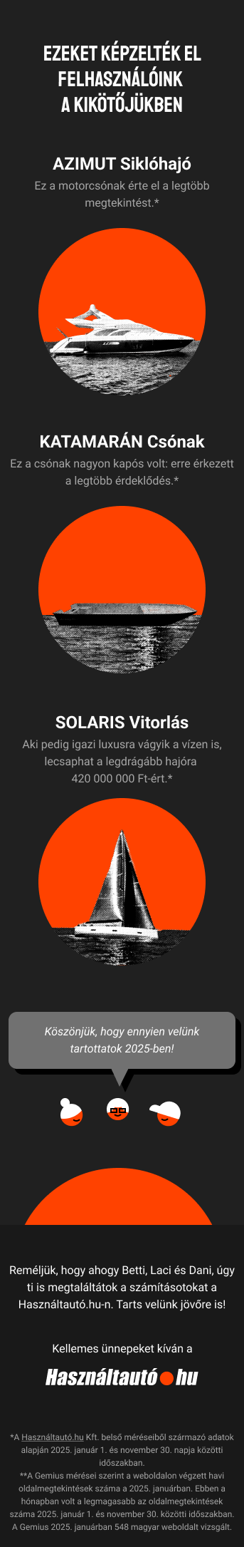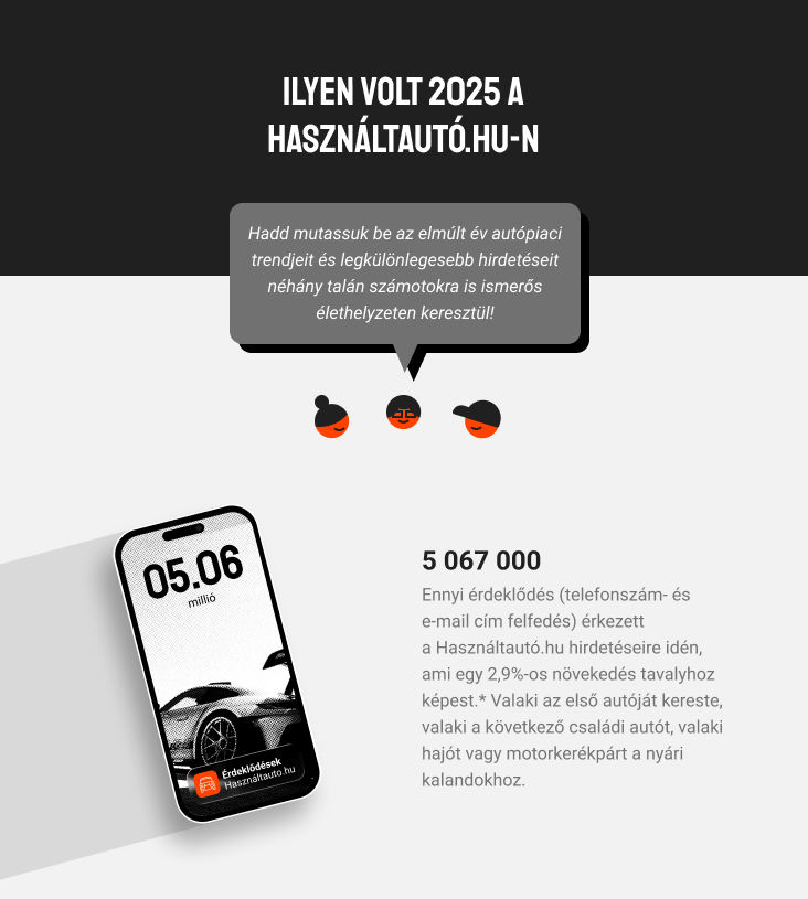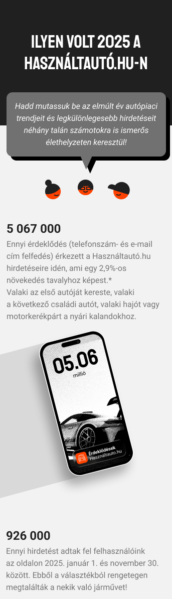 Főoldal / Magazin / Ha autót adnál el Friss cikkek 2026 elején dobogóra lépett a Transporter: így alakult a verseny a kishaszonjármű-piacon 2026.02.20. 3 perc olvasási idő Ki és miért vesz veterán autót? – Használtautó.hu GT 2026.02.19. 2 perc olvasási idő 1,5 milliárdért hirdetik ezt a limitált Koenigsegg Jeskot a Használtautó.hu-n! 2026.02.18. 2 perc olvasási idő